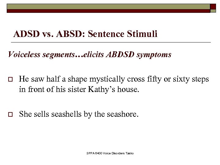 ADSD vs. ABSD: Sentence Stimuli Voiceless segments…elicits ABDSD symptoms o He saw half a shape mystically cross fifty or sixty steps in front of his sister Kathy’s house. o She sells seashells by the seashore. SPPA 6400 Voice Disorders Tasko