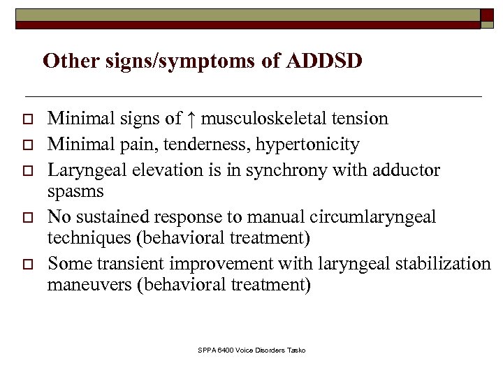 Other signs/symptoms of ADDSD o o o Minimal signs of ↑ musculoskeletal tension Minimal pain, tenderness, hypertonicity Laryngeal elevation is in synchrony with adductor spasms No sustained response to manual circumlaryngeal techniques (behavioral treatment) Some transient improvement with laryngeal stabilization maneuvers (behavioral treatment) SPPA 6400 Voice Disorders Tasko