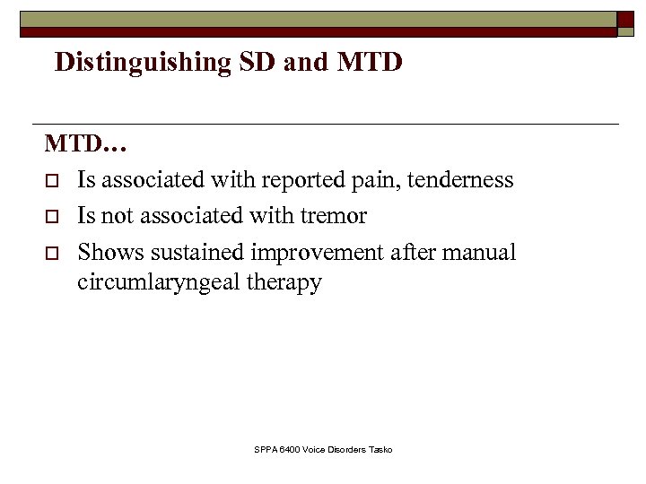 Distinguishing SD and MTD… o Is associated with reported pain, tenderness o Is not associated with tremor o Shows sustained improvement after manual circumlaryngeal therapy SPPA 6400 Voice Disorders Tasko