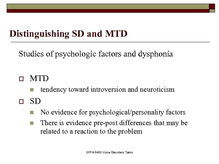 Distinguishing SD and MTD Studies of psychologic factors and dysphonia o MTD n o tendency toward introversion and neuroticism SD n n No evidence for psychological/personality factors There is evidence pre-post differences that may be related to a reaction to the problem SPPA 6400 Voice Disorders Tasko