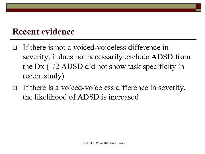 Recent evidence o o If there is not a voiced-voiceless difference in severity, it does not necessarily exclude ADSD from the Dx (1/2 ADSD did not show task specificity in recent study) If there is a voiced-voiceless difference in severity, the likelihood of ADSD is increased SPPA 6400 Voice Disorders Tasko