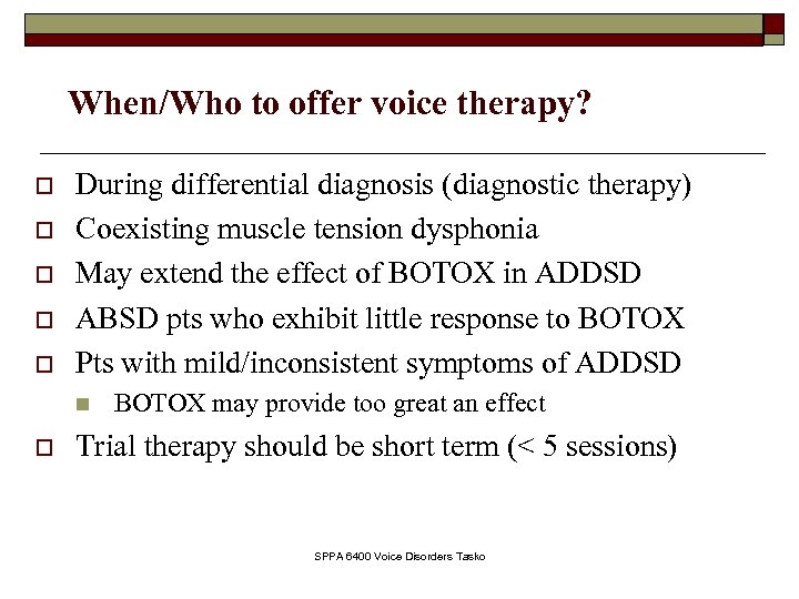 When/Who to offer voice therapy? o o o During differential diagnosis (diagnostic therapy) Coexisting muscle tension dysphonia May extend the effect of BOTOX in ADDSD ABSD pts who exhibit little response to BOTOX Pts with mild/inconsistent symptoms of ADDSD n o BOTOX may provide too great an effect Trial therapy should be short term (< 5 sessions) SPPA 6400 Voice Disorders Tasko