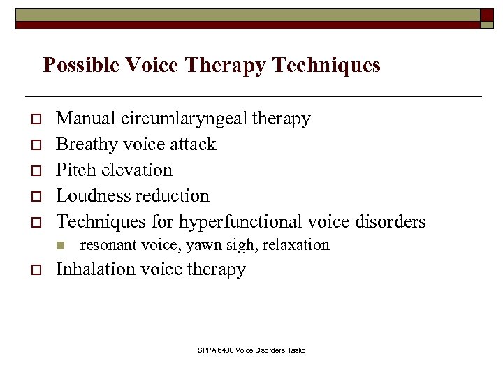 Possible Voice Therapy Techniques o o o Manual circumlaryngeal therapy Breathy voice attack Pitch elevation Loudness reduction Techniques for hyperfunctional voice disorders n o resonant voice, yawn sigh, relaxation Inhalation voice therapy SPPA 6400 Voice Disorders Tasko
