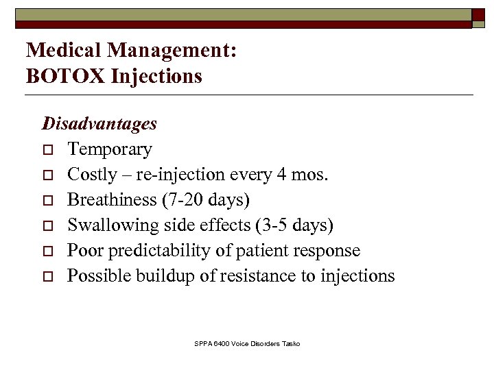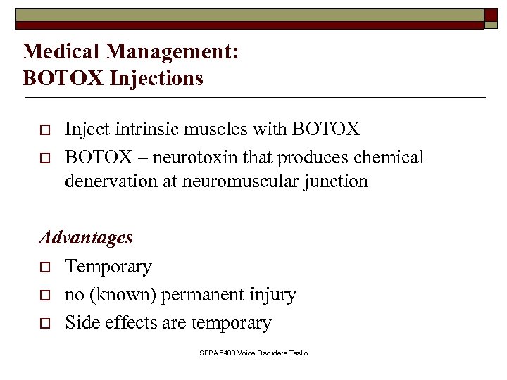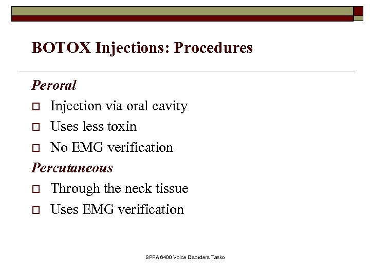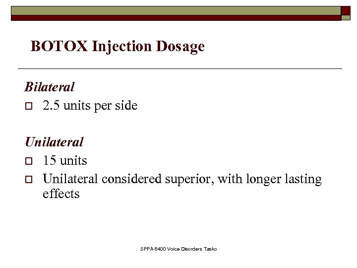 BOTOX Injection Dosage Bilateral o 2. 5 units per side Unilateral o 15 units o Unilateral considered superior, with longer lasting effects SPPA 6400 Voice Disorders Tasko