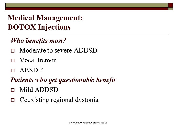 Medical Management: BOTOX Injections Who benefits most? o Moderate to severe ADDSD o Vocal tremor o ABSD ? Patients who get questionable benefit o Mild ADDSD o Coexisting regional dystonia SPPA 6400 Voice Disorders Tasko