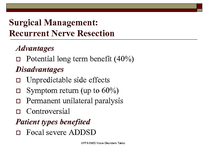 Surgical Management: Recurrent Nerve Resection Advantages o Potential long term benefit (40%) Disadvantages o Unpredictable side effects o Symptom return (up to 60%) o Permanent unilateral paralysis o Controversial Patient types benefited o Focal severe ADDSD SPPA 6400 Voice Disorders Tasko