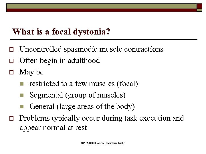 What is a focal dystonia? o o Uncontrolled spasmodic muscle contractions Often begin in adulthood May be n restricted to a few muscles (focal) n Segmental (group of muscles) n General (large areas of the body) Problems typically occur during task execution and appear normal at rest SPPA 6400 Voice Disorders Tasko
