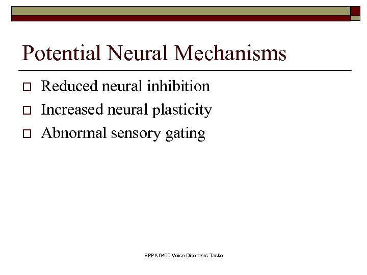 Potential Neural Mechanisms o o o Reduced neural inhibition Increased neural plasticity Abnormal sensory gating SPPA 6400 Voice Disorders Tasko