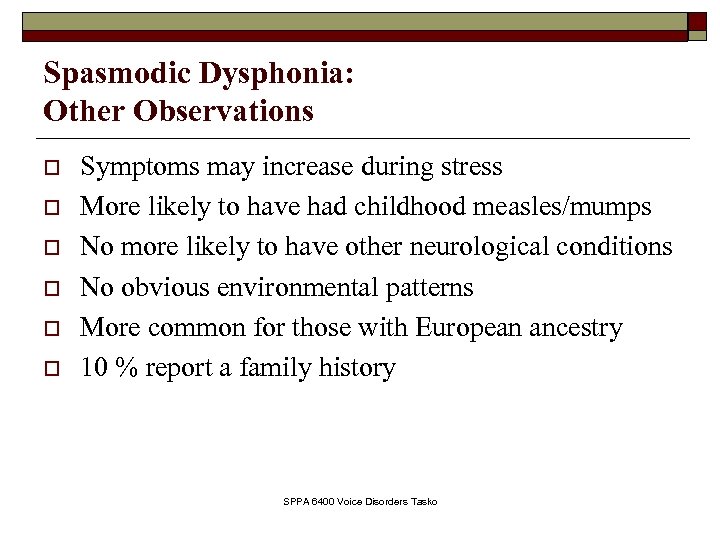 Spasmodic Dysphonia: Other Observations o o o Symptoms may increase during stress More likely to have had childhood measles/mumps No more likely to have other neurological conditions No obvious environmental patterns More common for those with European ancestry 10 % report a family history SPPA 6400 Voice Disorders Tasko