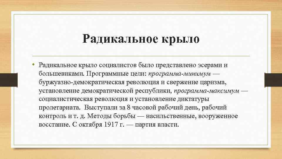 Радикальное крыло • Радикальное крыло социалистов было представлено эсерами и большевиками. Программные цели: программа-минимум — буржуазно-демократическая революция и свержение царизма, установление демократической республики, программа-максимум — социалистическая революция и установление диктатуры пролетариата. Выступали за 8 часовой рабочий день, рабочий контроль и т. д. Методы борьбы — насильственные, вооруженное восстание. С октября 1917 г. — партия власти.