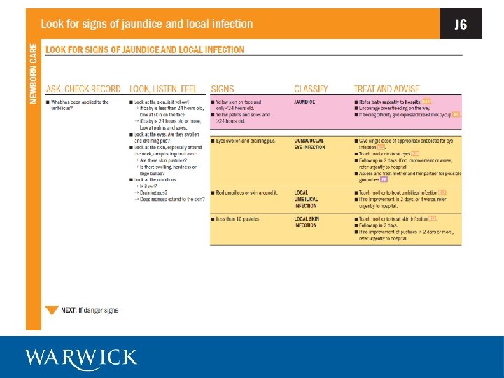Neonatal jaundice • Premature babies are an increased risk of jaundice as well as infection. • Severe jaundice peaks at around day 3 and babies may be home by then. • Implementing a systematic predischarge check of mothers and babies is an opportunity to prevent complications or increase careseeking.