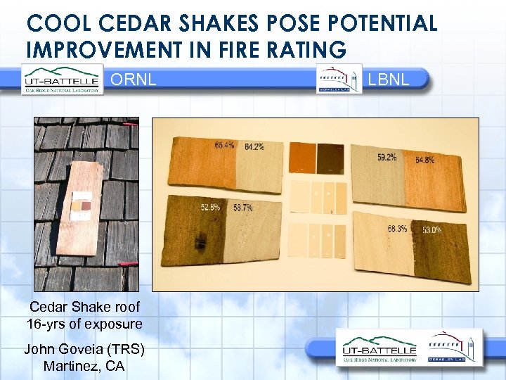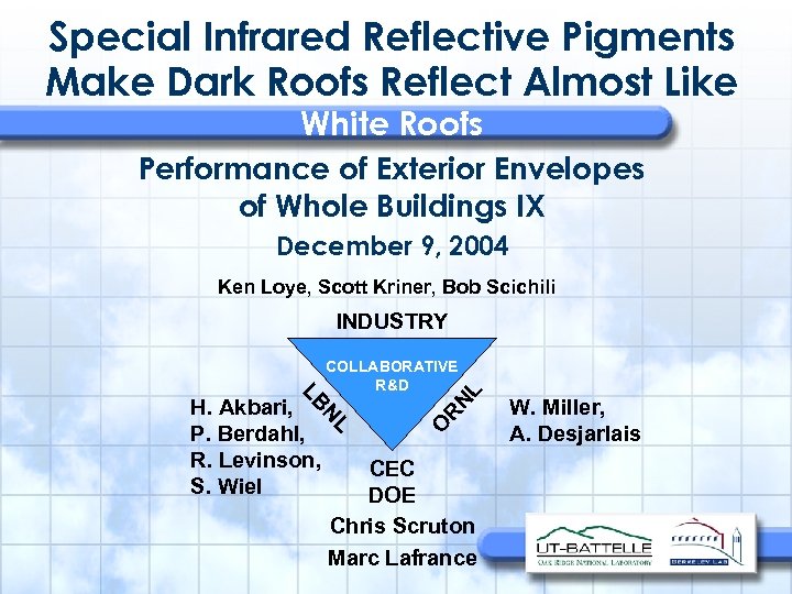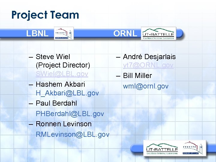 Project Team LBNL ORNL – Steve Wiel – André Desjarlais (Project Director) yt 7@ORNL. gov SWiel@LBL. gov – Bill Miller – Hashem Akbari wml@ornl. gov H_Akbari@LBL. gov – Paul Berdahl PHBerdahl@LBL. gov – Ronnen Levinson RMLevinson@LBL. gov