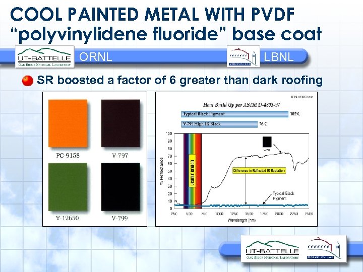 COOL PAINTED METAL WITH PVDF “polyvinylidene fluoride” base coat ORNL LBNL SR boosted a factor of 6 greater than dark roofing