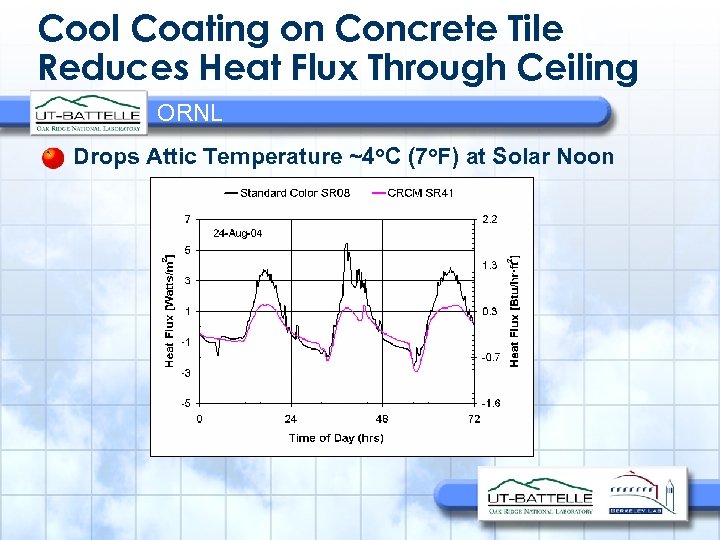 Cool Coating on Concrete Tile Reduces Heat Flux Through Ceiling ORNL Drops Attic Temperature ~4 o. C (7 o. F) at Solar Noon