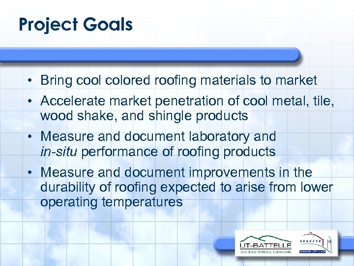 Project Goals • Bring cool colored roofing materials to market • Accelerate market penetration of cool metal, tile, wood shake, and shingle products • Measure and document laboratory and in-situ performance of roofing products • Measure and document improvements in the durability of roofing expected to arise from lower operating temperatures
