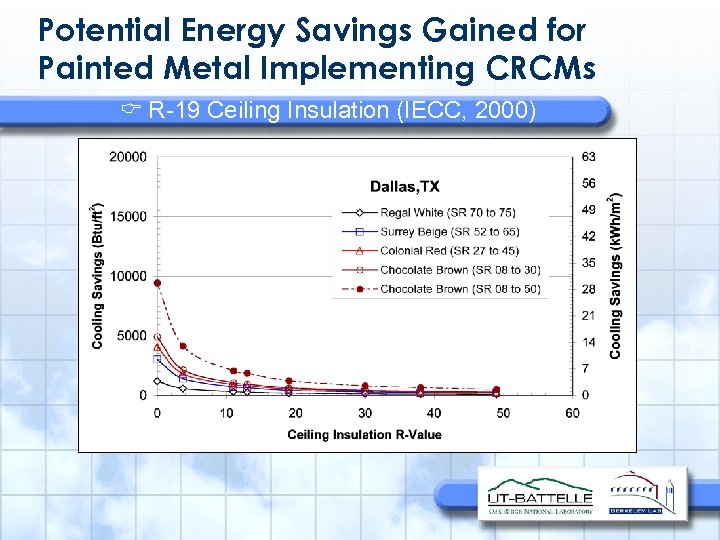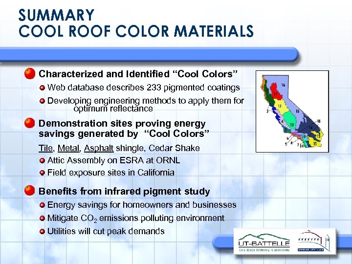 SUMMARY COOL ROOF COLOR MATERIALS Characterized and Identified “Cool Colors” Web database describes 233 pigmented coatings Developing engineering methods to apply them for optimum reflectance Demonstration sites proving energy savings generated by “Cool Colors” Tile, Metal, Asphalt shingle, Cedar Shake Attic Assembly on ESRA at ORNL Field exposure sites in California Benefits from infrared pigment study Energy savings for homeowners and businesses Mitigate CO 2 emissions polluting environment Utilities will cut peak demands