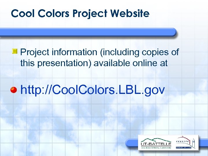 Cool Colors Project Website • Project information (including copies of this presentation) available online at http: //Cool. Colors. LBL. gov
