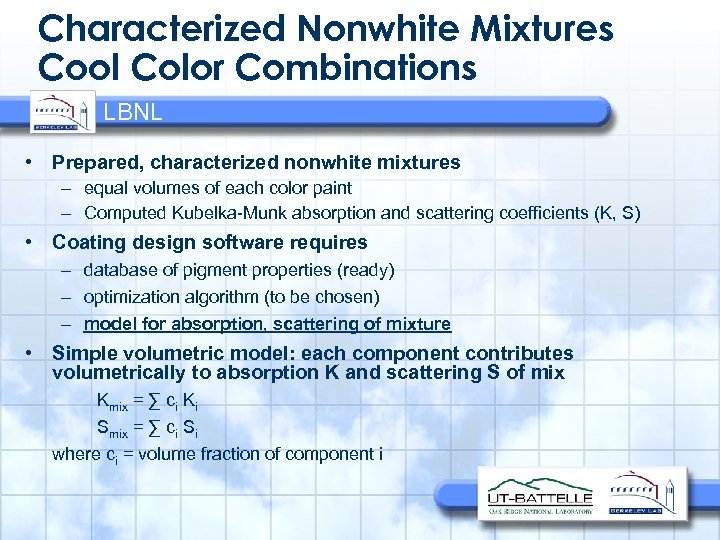 Characterized Nonwhite Mixtures Cool Color Combinations LBNL • Prepared, characterized nonwhite mixtures – equal volumes of each color paint – Computed Kubelka-Munk absorption and scattering coefficients (K, S) • Coating design software requires – database of pigment properties (ready) – optimization algorithm (to be chosen) – model for absorption, scattering of mixture • Simple volumetric model: each component contributes volumetrically to absorption K and scattering S of mix Kmix = ∑ ci Ki Smix = ∑ ci Si where ci = volume fraction of component i
