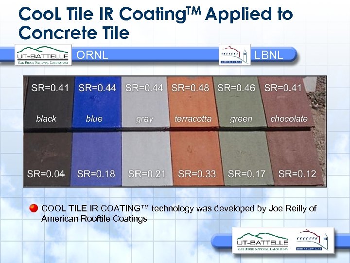 Coo. L Tile IR Coating. TM Applied to Concrete Tile ORNL LBNL COOL TILE IR COATING™ technology was developed by Joe Reilly of American Rooftile Coatings