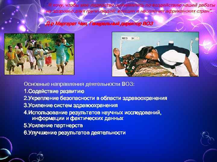 "Я хочу, чтобы мое лидерство оценивалось по воздействию нашей работы на здоровье двух групп людей: женщин и населения африканских стран". Д-р Маргарет Чен, Генеральный директор ВОЗ Основные направления деятельности ВОЗ: 1. Содействие развитию 2. Укрепление безопасности в области здравоохранения 3. Усиление систем здравоохранения 4. Использование результатов научных исследований, информации и фактических данных 5. Усиление партнерств 6. Улучшение результатов деятельности