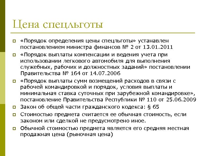 Цена спецльготы p p p «Порядок определения цены спецльготы» устанавлен постановлением министра финансов № 2 от 13. 01. 2011 «Порядок выплаты компенсации и ведения учета при использовании легкового автомобиля для выполнения служебных, рабочих и должностных заданий» постановлении Правительства № 164 от 14. 07. 2006 «Порядок выплаты сумм возмещений расходов в связи с рабочей командировкой и порядок, условия выплаты и минимальная ставка суточных при зарубежной командировке» , постановление Правительства Республики № 110 от 25. 06. 2009 Закон об общей части гражданского кодекса: § 65 Стоимостью предмета считается ее обычная стоимость, если законом или сделкой не предусмотрено иное. Обычной стоимостью предмета является его средняя местная продажная цена (рыночная цена)