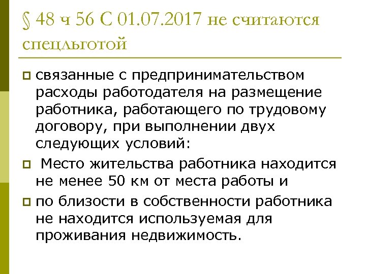 § 48 ч 56 С 01. 07. 2017 не считаются спецльготой связанные с предпринимательством расходы работодателя на размещение работника, работающего по трудовому договору, при выполнении двух следующих условий: p Место жительства работника находится не менее 50 км от места работы и p по близости в собственности работника не находится используемая для проживания недвижимость. p