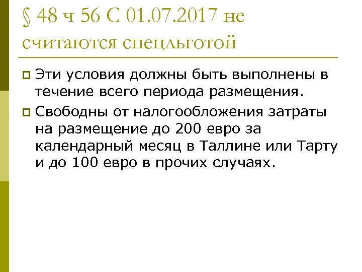 § 48 ч 56 С 01. 07. 2017 не считаются спецльготой Эти условия должны быть выполнены в течение всего периода размещения. p Свободны от налогообложения затраты на размещение до 200 евро за календарный месяц в Таллине или Тарту и до 100 евро в прочих случаях. p
