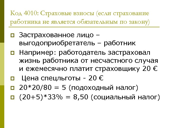 Код 4010: Страховые взносы (если страхование работника не является обязательным по закону) p p p Застрахованное лицо – выгодоприобретатель – работник Например: работодатель застраховал жизнь работника от несчастного случая и ежемесячно платит страховщику 20 € Цена спецльготы - 20 € 20*20/80 = 5 (подоходный налог) (20+5)*33% = 8, 50 (социальный налог)