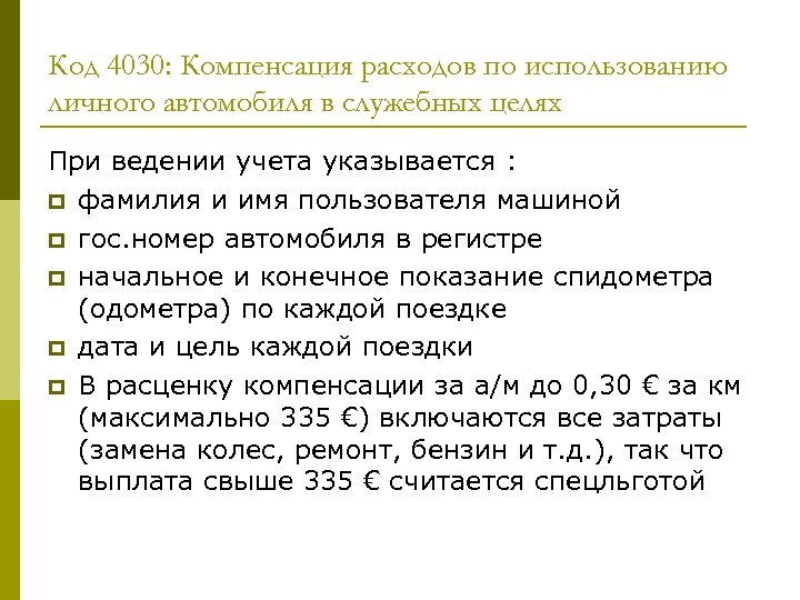 Код 4030: Компенсация расходов по использованию личного автомобиля в служебных целях При ведении учета указывается : p фамилия и имя пользователя машиной p гос. номер автомобиля в регистре p начальное и конечное показание спидометра (одометра) по каждой поездке p дата и цель каждой поездки p В расценку компенсации за а/м до 0, 30 € за км (максимально 335 €) включаются все затраты (замена колес, ремонт, бензин и т. д. ), так что выплата свыше 335 € считается спецльготой