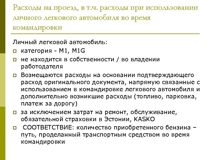 Расходы на проезд, в т. ч. расходы при использовании личного легкового автомобиля во время командировки Личный легковой автомобиль: p категория - M 1, M 1 G p не находится в собственности / во владении работодателя p Возмещаются расходы на основании подтверждающего расход оригинального документа, напрямую связанные с использованием в командировке легкового автомобиля и дополнительно возникшие расходы (топливо, парковка, платеж за дорогу) p за исключением затрат на ремонт, обслуживание, обязательной страховки в Эстонии, KASKO p СООТВЕТСТВИЕ: количество приобретенного бензина – путь, проделанный транспортным средством во время командировки