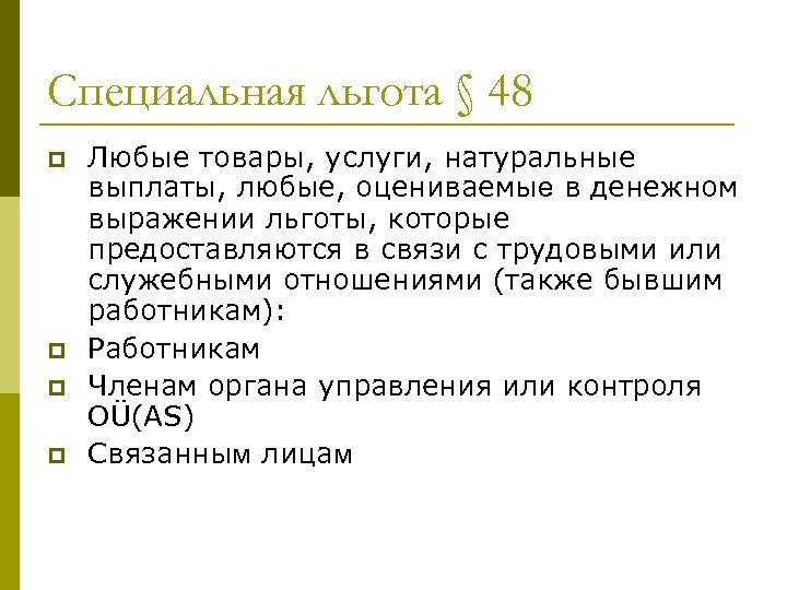 Специальная льгота § 48 p p Любые товары, услуги, натуральные выплаты, любые, оцениваемые в денежном выражении льготы, которые предоставляются в связи с трудовыми или служебными отношениями (также бывшим работникам): Работникам Членам органа управления или контроля OÜ(AS) Связанным лицам
