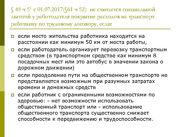 § 48 ч 51 с 01. 07. 2017(§ 61 ч 52) не считается специальной льготой у работодателя покрытие расходов на транспорт работнику по трудовому договору, если: p p если место жительства работника находится на расстоянии как минимум 50 км от места работы, если работодатель организует перевозку транспортным средством (в транспортном средстве как минимум 8 посадочных мест или это автобус в значении закона о дорожном движении) если преодоление пути на общественном транспорте не представляется возможным при разумных затратах времени и денежных средств если работник с ограниченными возможностями по здоровью: - нет возможности использовать общественный транспорт или - использование общественного транспорта существенно снижает способности к передвижению и трудоспособности.