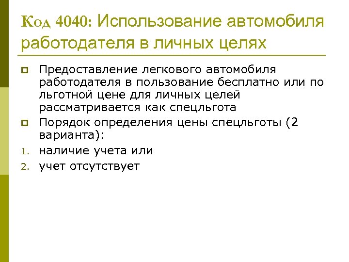 Код 4040: Использование автомобиля работодателя в личных целях p p 1. 2. Предоставление легкового автомобиля работодателя в пользование бесплатно или по льготной цене для личных целей рассматривается как спецльгота Порядок определения цены спецльготы (2 варианта): наличие учета или учет отсутствует