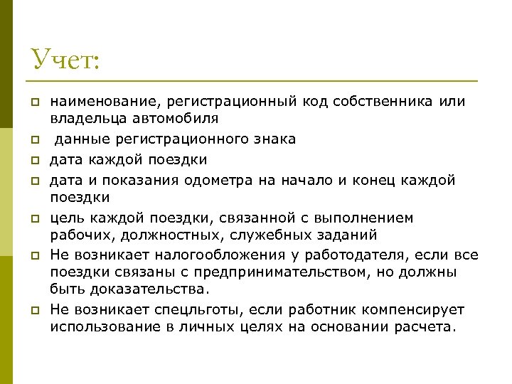 Учет: p p p p наименование, регистрационный код собственника или владельца автомобиля данные регистрационного знака дата каждой поездки дата и показания одометра на начало и конец каждой поездки цель каждой поездки, связанной с выполнением рабочих, должностных, служебных заданий Не возникает налогообложения у работодателя, если все поездки связаны с предпринимательством, но должны быть доказательства. Не возникает спецльготы, если работник компенсирует использование в личных целях на основании расчета.