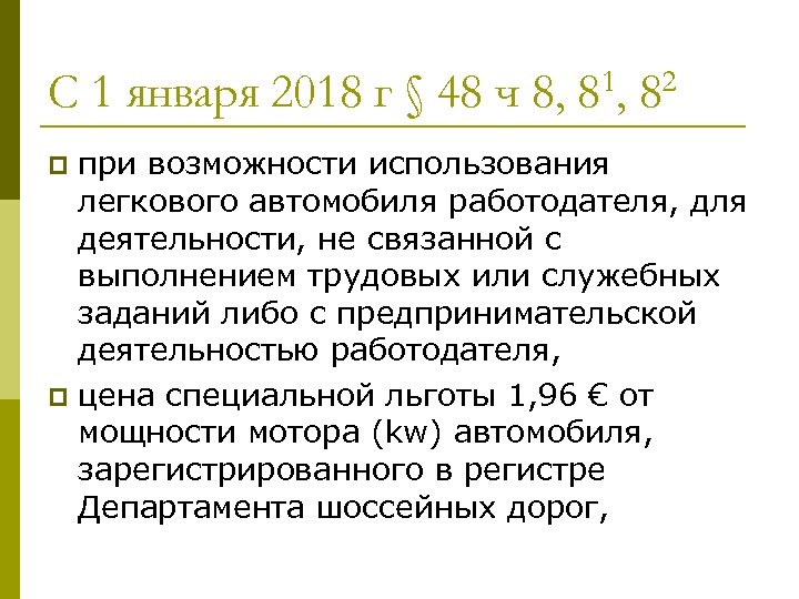 С 1 января 2018 г § 48 ч 8, 81, 82 при возможности использования легкового автомобиля работодателя, для деятельности, не связанной с выполнением трудовых или служебных заданий либо с предпринимательской деятельностью работодателя, p цена специальной льготы 1, 96 € от мощности мотора (kw) автомобиля, зарегистрированного в регистре Департамента шоссейных дорог, p