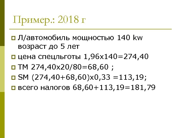Пример. : 2018 г Л/автомобиль мощностью 140 kw возраст до 5 лет p цена спецльготы 1, 96 х140=274, 40 p TM 274, 40 х20/80=68, 60 ; p SM (274, 40+68, 60)х0, 33 =113, 19; p всего налогов 68, 60+113, 19=181, 79 p