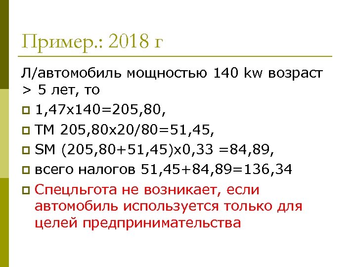 Пример. : 2018 г Л/автомобиль мощностью 140 kw возраст > 5 лет, то p 1, 47 х140=205, 80, p TM 205, 80 х20/80=51, 45, p SM (205, 80+51, 45)х0, 33 =84, 89, p всего налогов 51, 45+84, 89=136, 34 p Спецльгота не возникает, если автомобиль используется только для целей предпринимательства