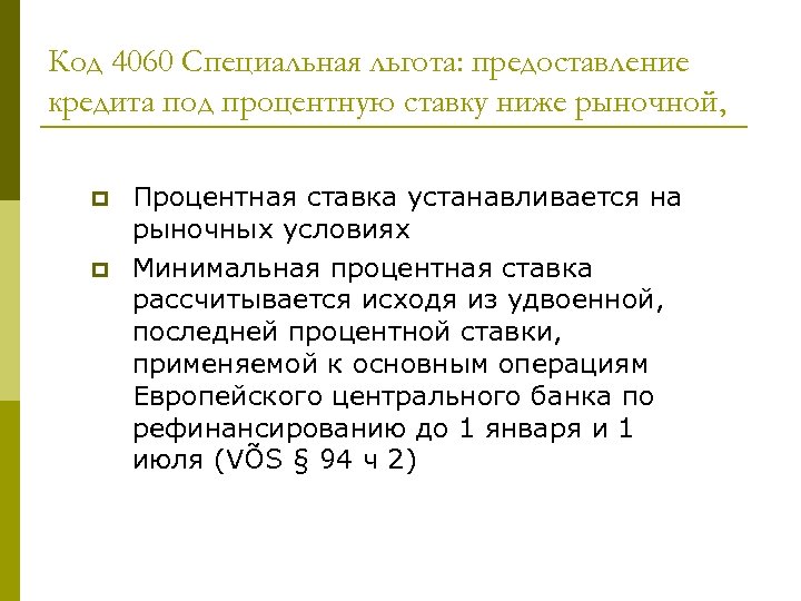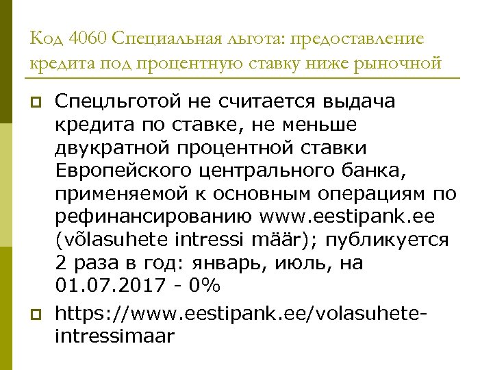 Код 4060 Специальная льгота: предоставление кредита под процентную ставку ниже рыночной p p Спецльготой не считается выдача кредита по ставке, не меньше двукратной процентной ставки Европейского центрального банка, применяемой к основным операциям по рефинансированию www. eestipank. ee (võlasuhete intressi määr); публикуется 2 раза в год: январь, июль, на 01. 07. 2017 - 0% https: //www. eestipank. ee/volasuheteintressimaar