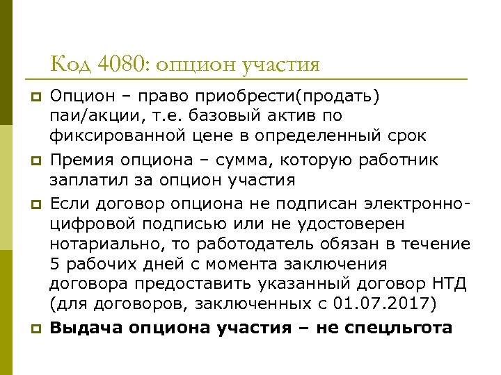 Код 4080: опцион участия p p Опцион – право приобрести(продать) паи/акции, т. е. базовый актив по фиксированной цене в определенный срок Премия опциона – сумма, которую работник заплатил за опцион участия Если договор опциона не подписан электронноцифровой подписью или не удостоверен нотариально, то работодатель обязан в течение 5 рабочих дней с момента заключения договора предоставить указанный договор НТД (для договоров, заключенных с 01. 07. 2017) Выдача опциона участия – не спецльгота