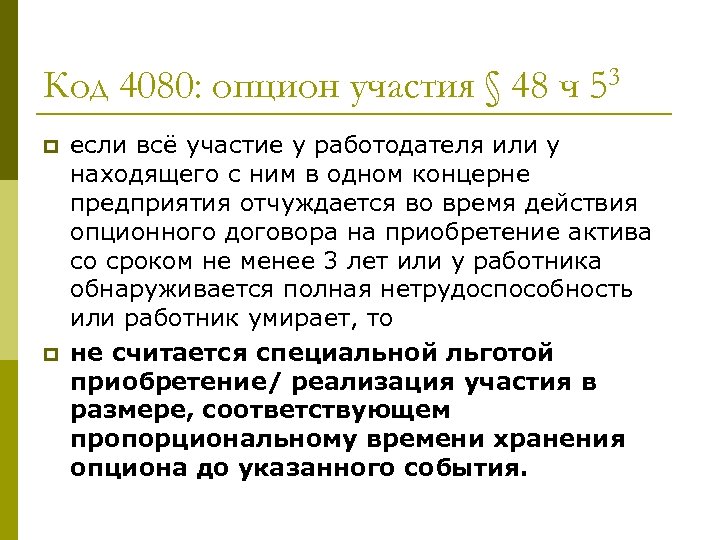 Код 4080: опцион участия § 48 ч 53 p p если всё участие у работодателя или у находящего с ним в одном концерне предприятия отчуждается во время действия опционного договора на приобретение актива со сроком не менее 3 лет или у работника обнаруживается полная нетрудоспособность или работник умирает, то не считается специальной льготой приобретение/ реализация участия в размере, соответствующем пропорциональному времени хранения опциона до указанного события.
