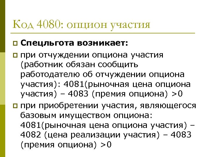 Код 4080: опцион участия Спецльгота возникает: p при отчуждении опциона участия (работник обязан сообщить работодателю об отчуждении опциона участия): 4081(рыночная цена опциона участия) – 4083 (премия опциона) >0 p приобретении участия, являющегося базовым имуществом опциона: 4081(рыночная цена опциона участия) – 4082 (цена реализации участия) – 4083 (премия опциона) >0 p