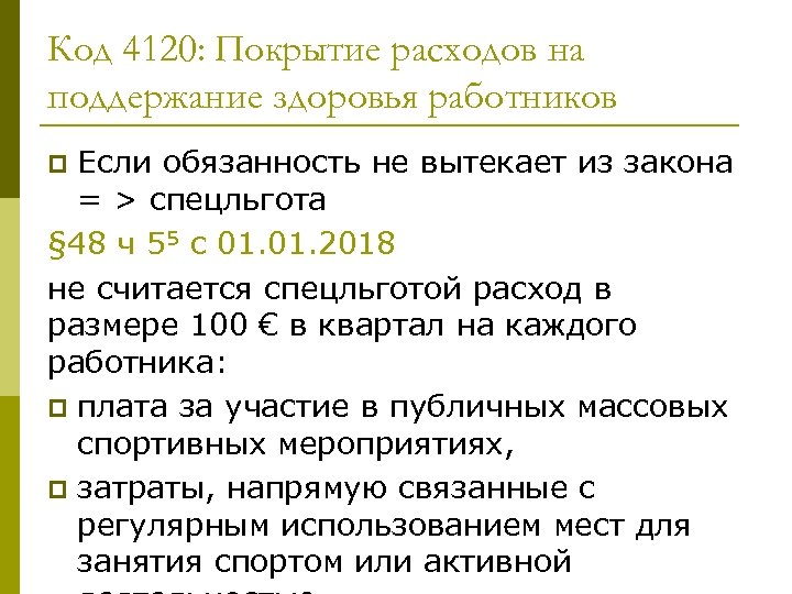 Код 4120: Покрытие расходов на поддержание здоровья работников Если обязанность не вытекает из закона = > спецльгота § 48 ч 55 с 01. 2018 не считается спецльготой расход в размере 100 € в квартал на каждого работника: p плата за участие в публичных массовых спортивных мероприятиях, p затраты, напрямую связанные с регулярным использованием мест для занятия спортом или активной p