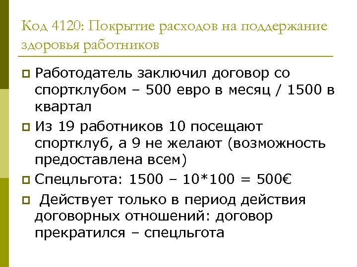 Код 4120: Покрытие расходов на поддержание здоровья работников Работодатель заключил договор со спортклубом – 500 евро в месяц / 1500 в квартал p Из 19 работников 10 посещают спортклуб, а 9 не желают (возможность предоставлена всем) p Спецльгота: 1500 – 10*100 = 500€ p Действует только в период действия договорных отношений: договор прекратился – спецльгота p
