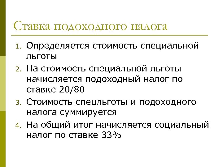 Ставка подоходного налога 1. 2. 3. 4. Определяется стоимость специальной льготы На стоимость специальной льготы начисляется подоходный налог по ставке 20/80 Стоимость спецльготы и подоходного налога суммируется На общий итог начисляется социальный налог по ставке 33%