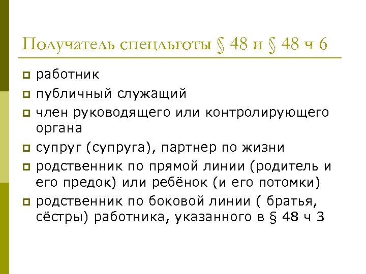 Получатель спецльготы § 48 и § 48 ч 6 p p p работник публичный служащий член руководящего или контролирующего органа супруг (супруга), партнер по жизни родственник по прямой линии (родитель и его предок) или ребёнок (и его потомки) родственник по боковой линии ( братья, сёстры) работника, указанного в § 48 ч 3