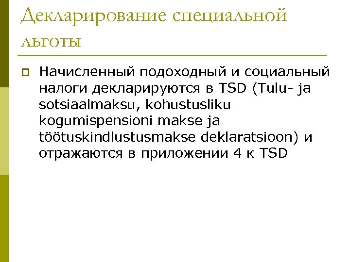Декларирование специальной льготы p Начисленный подоходный и социальный налоги декларируются в TSD (Tulu- ja sotsiaalmaksu, kohustusliku kogumispensioni makse ja töötuskindlustusmakse deklaratsioon) и отражаются в приложении 4 к TSD