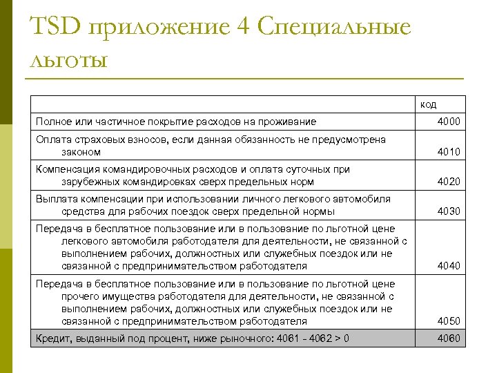 TSD приложение 4 Специальные льготы код Полное или частичное покрытие расходов на проживание 4000 Оплата страховых взносов, если данная обязанность не предусмотрена законом 4010 Компенсация командировочных расходов и оплата суточных при зарубежных командировках сверх предельных норм 4020 Выплата компенсации при использовании личного легкового автомобиля средства для рабочих поездок сверх предельной нормы 4030 Передача в бесплатное пользование или в пользование по льготной цене легкового автомобиля работодателя деятельности, не связанной с выполнением рабочих, должностных или служебных поездок или не связанной с предпринимательством работодателя 4040 Передача в бесплатное пользование или в пользование по льготной цене прочего имущества работодателя деятельности, не связанной с выполнением рабочих, должностных или служебных поездок или не связанной с предпринимательством работодателя 4050 Кредит, выданный под процент, ниже рыночного: 4061 - 4062 > 0 4060
