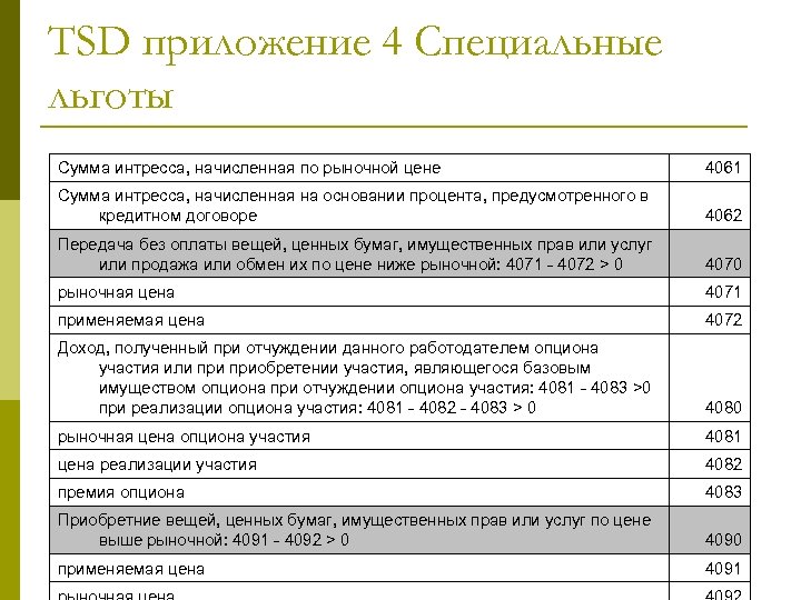 TSD приложение 4 Специальные льготы Сумма интресса, начисленная по рыночной цене 4061 Сумма интресса, начисленная на основании процента, предусмотренного в кредитном договоре 4062 Передача без оплаты вещей, ценных бумаг, имущественных прав или услуг или продажа или обмен их по цене ниже рыночной: 4071 - 4072 > 0 4070 рыночная цена 4071 применяемая цена 4072 Доход, полученный при отчуждении данного работодателем опциона участия или приобретении участия, являющегося базовым имуществом опциона при отчуждении опциона участия: 4081 - 4083 >0 при реализации опциона участия: 4081 - 4082 - 4083 > 0 4080 рыночная цена опциона участия 4081 цена реализации участия 4082 премия опциона 4083 Приобретние вещей, ценных бумаг, имущественных прав или услуг по цене выше рыночной: 4091 - 4092 > 0 4090 применяемая цена 4091