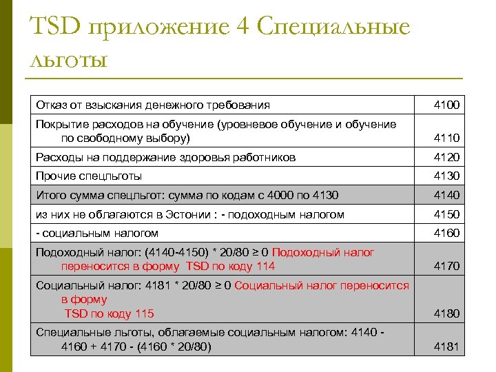 TSD приложение 4 Специальные льготы Отказ от взыскания денежного требования 4100 Покрытие расходов на обучение (уровневое обучение и обучение по свободному выбору) 4110 Расходы на поддержание здоровья работников 4120 Прочие спецльготы 4130 Итого сумма спецльгот: сумма по кодам с 4000 по 4130 4140 из них не облагаются в Эстонии : - подоходным налогом 4150 - социальным налогом 4160 Подоходный налог: (4140 -4150) * 20/80 ≥ 0 Подоходный налог переносится в форму TSD по коду 114 4170 Социальный налог: 4181 * 20/80 ≥ 0 Социальный налог переносится в форму TSD по коду 115 4180 Специальные льготы, облагаемые социальным налогом: 4140 - 4160 + 4170 - (4160 * 20/80) 4181