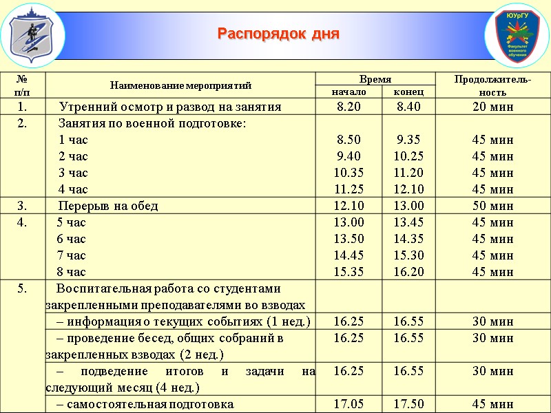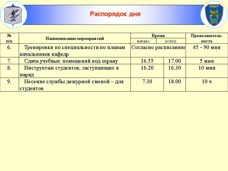 9. Приказ Министра обороны РФ № 666, Минобрнауки РФ № 249 от 10.07.2009 года «Об организации деятельности учебных военных центров, факультетов военного обучения и военных кафедр при федеральных государственных образовательных учреждениях высшего профессионального образования». 12. Устав ГОУ ВПО «Южно-Уральский государственный университет». 13. Программа военной подготовки сержантов и солдат по военно-учетным специальностям танко-технического и автотехнического обеспечения